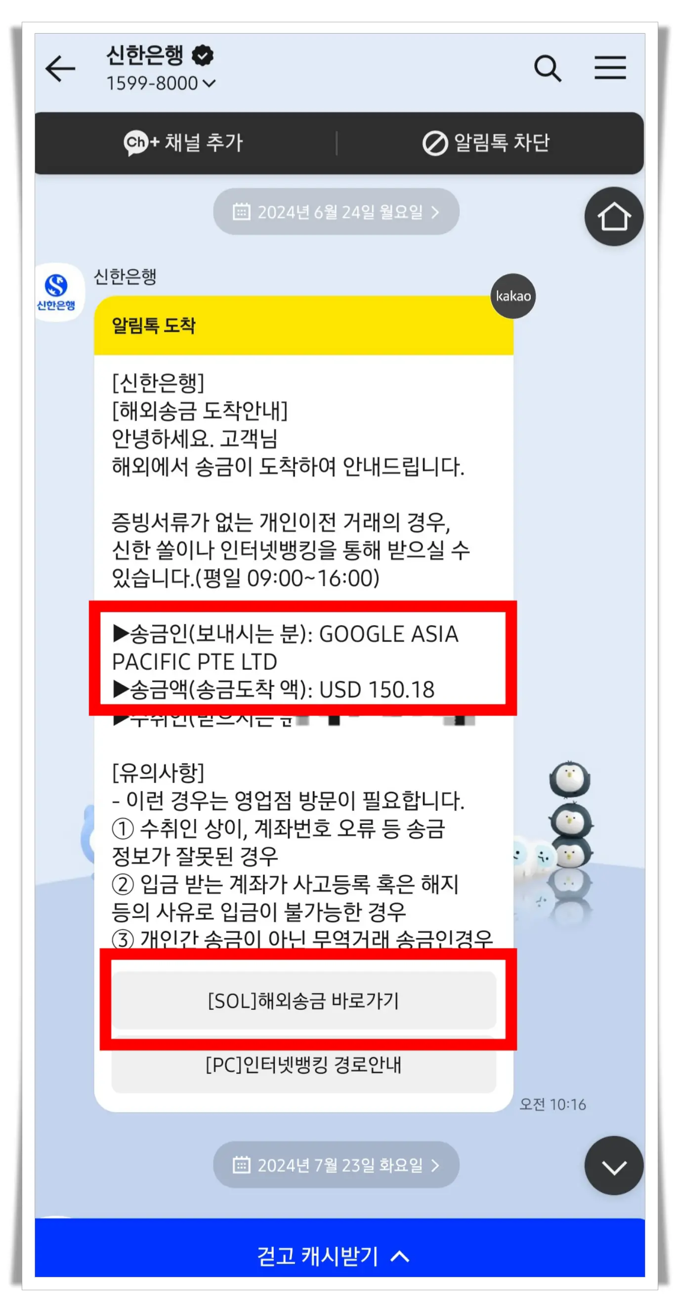 구글에서 애드센스 수익금이 정산된 외화 예금통장으로 입금됩니다.